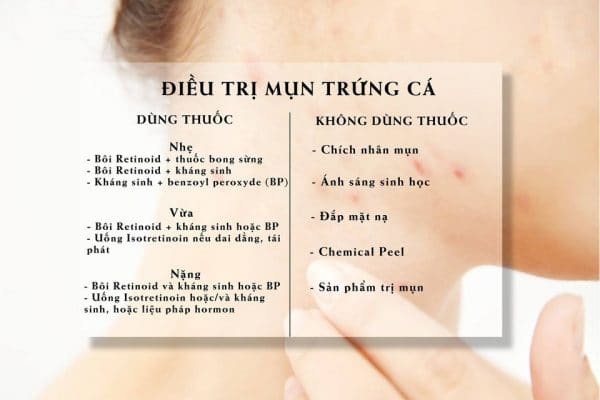 – NHẸ: Bôi retionid và thuốc bong sừng; Hoặc retonoid và kháng sinh; Hoặc kháng sinh và benzoyl peroxyde (BP).